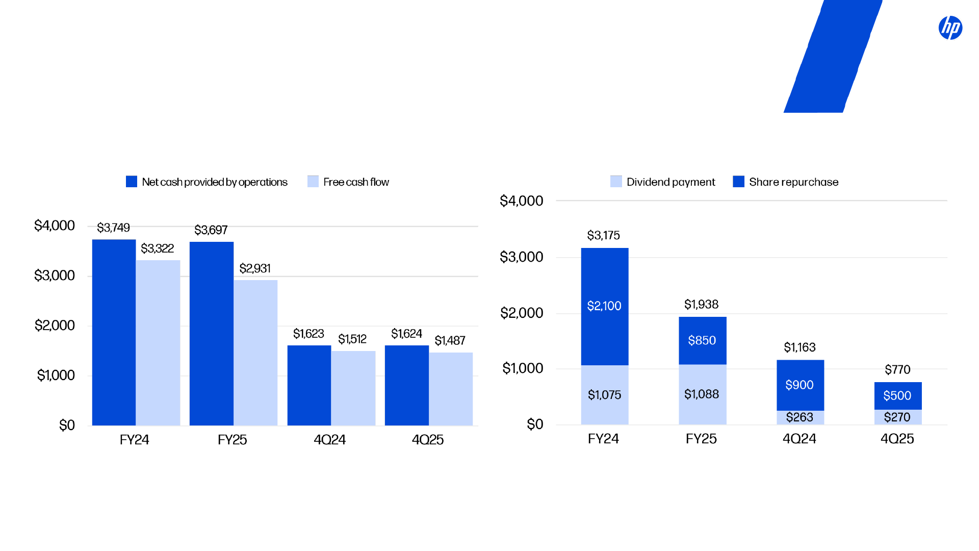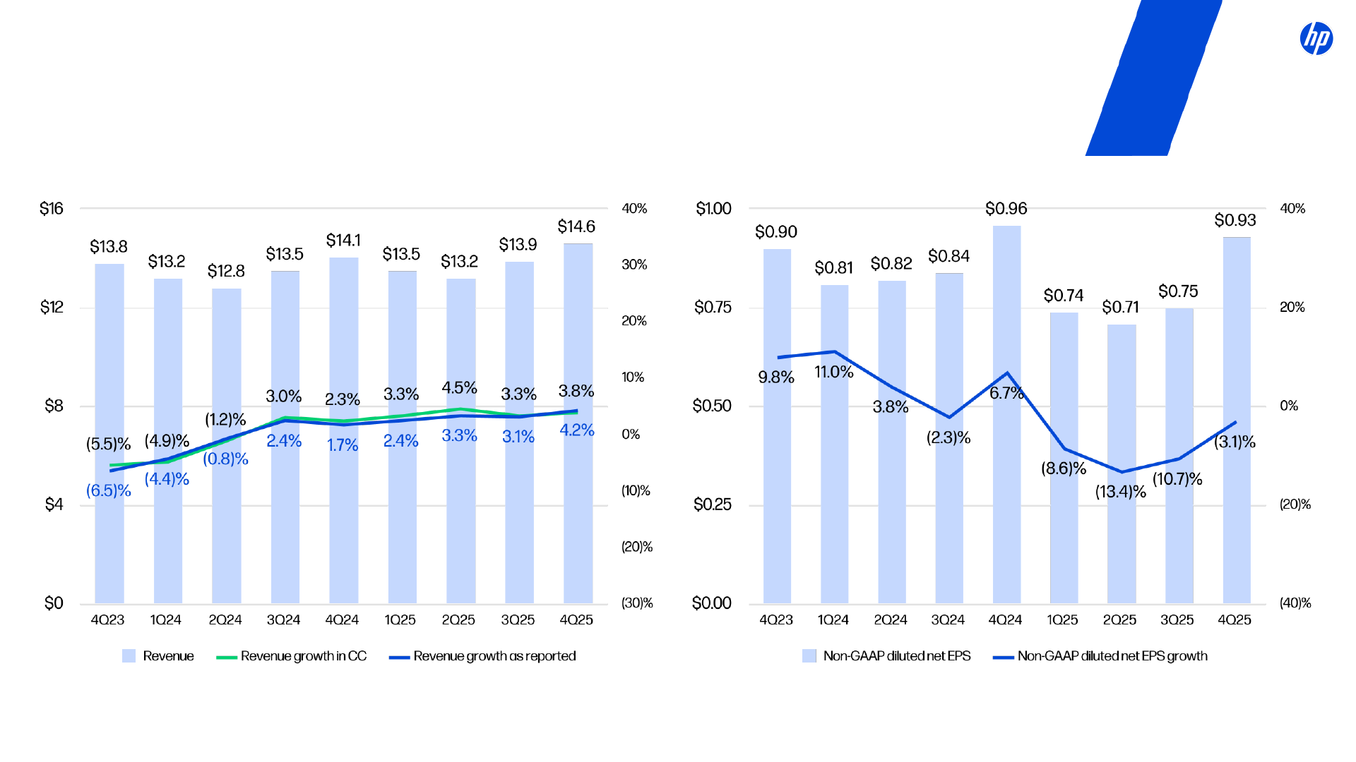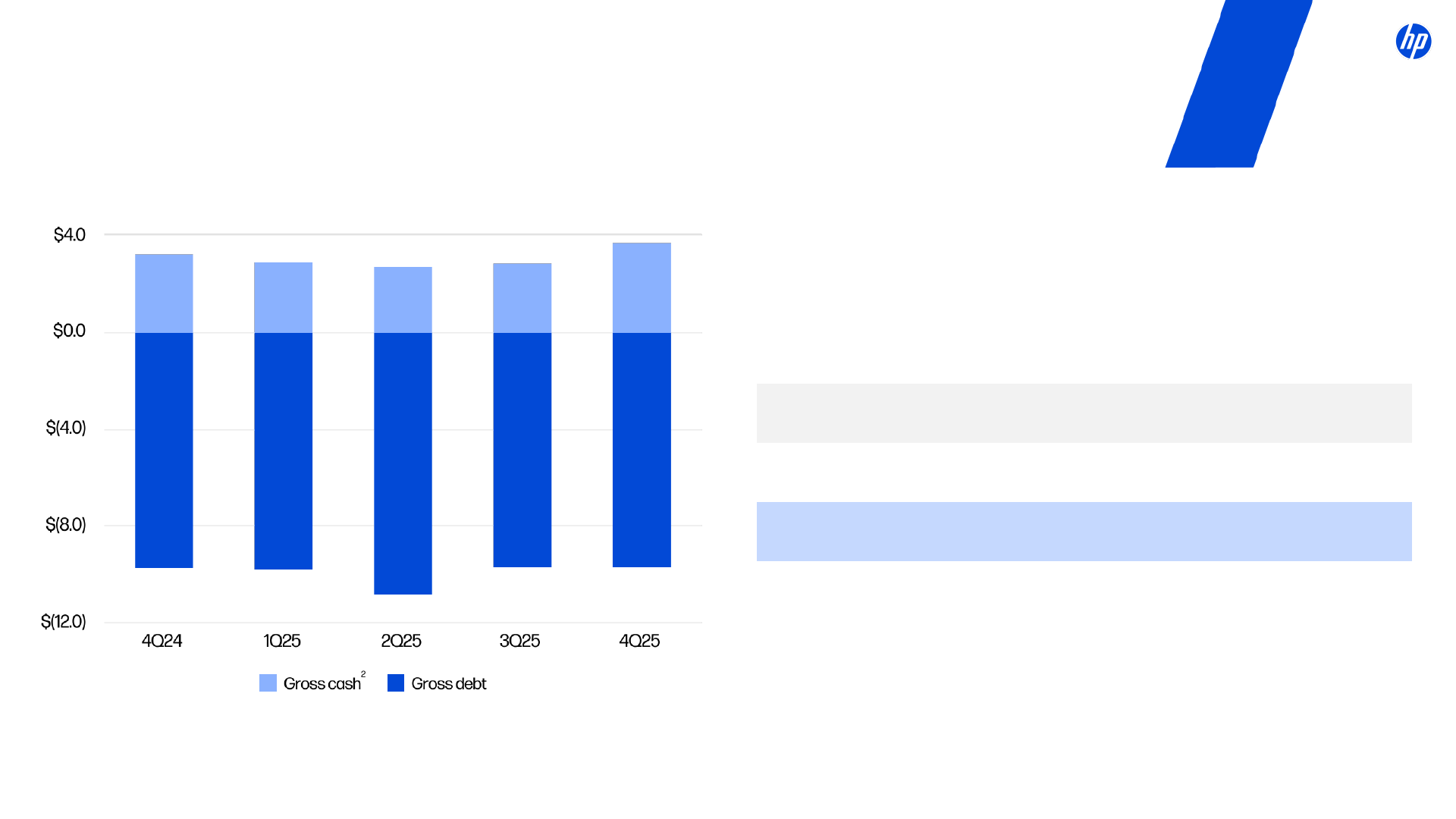 HP has included non-GAAP financial measures in this presentation to supplement HP's consolidated financial statements presented on a generally accepted accounting principles ("GAAP") basis. Definitions of these non-GAAP financial measures and reconciliations of these non-GAAP financial measures to the most directly comparable GAAP financial measures are included elsewhere in this presentation. HP's management uses net revenue on a constant currency basis, non-GAAP total operating expenses, non-GAAP operating profit, non-GAAP operating margin, non-GAAP other income and expenses, non-GAAP tax rate, non-GAAP net earnings, non-GAAP diluted net earnings per share, and other non-GAAP financial measures to evaluate and forecast HP's performance before gains, losses or other charges that are considered by HP's management to be outside of HP's core business segment operating results. Gross cash, net cash (debt), and free cash flow are liquidity measures that provide useful information to management about the amount of cash available for investment in HP's businesses, funding acquisitions, repurchasing stock and other purposes. Net cash (debt) provides useful information to management about the state of HP's consolidated balance sheet.