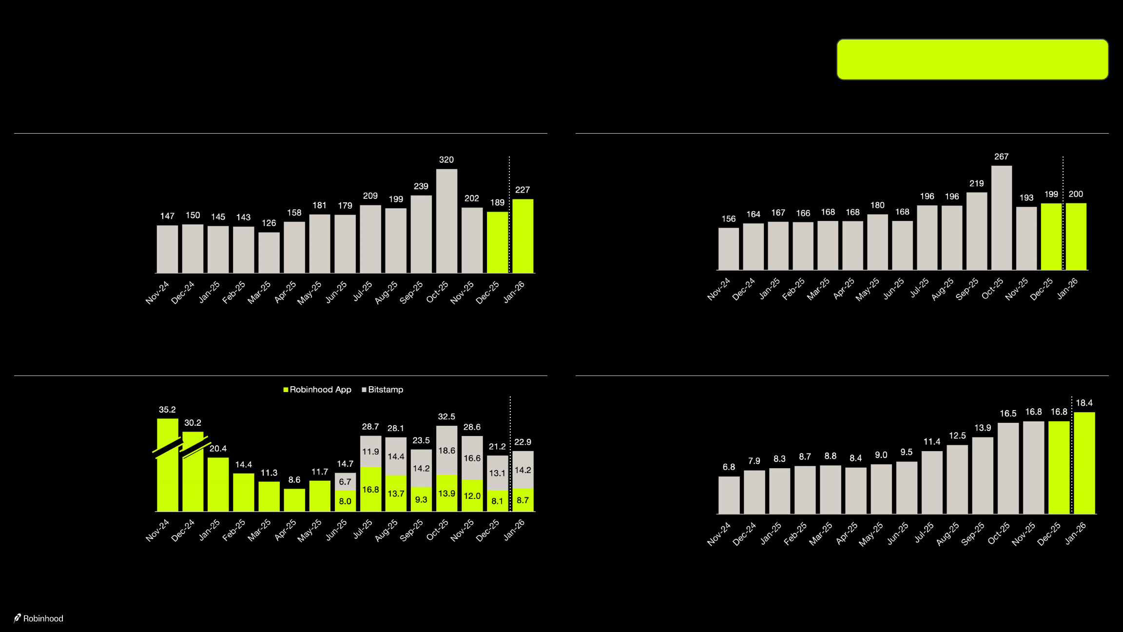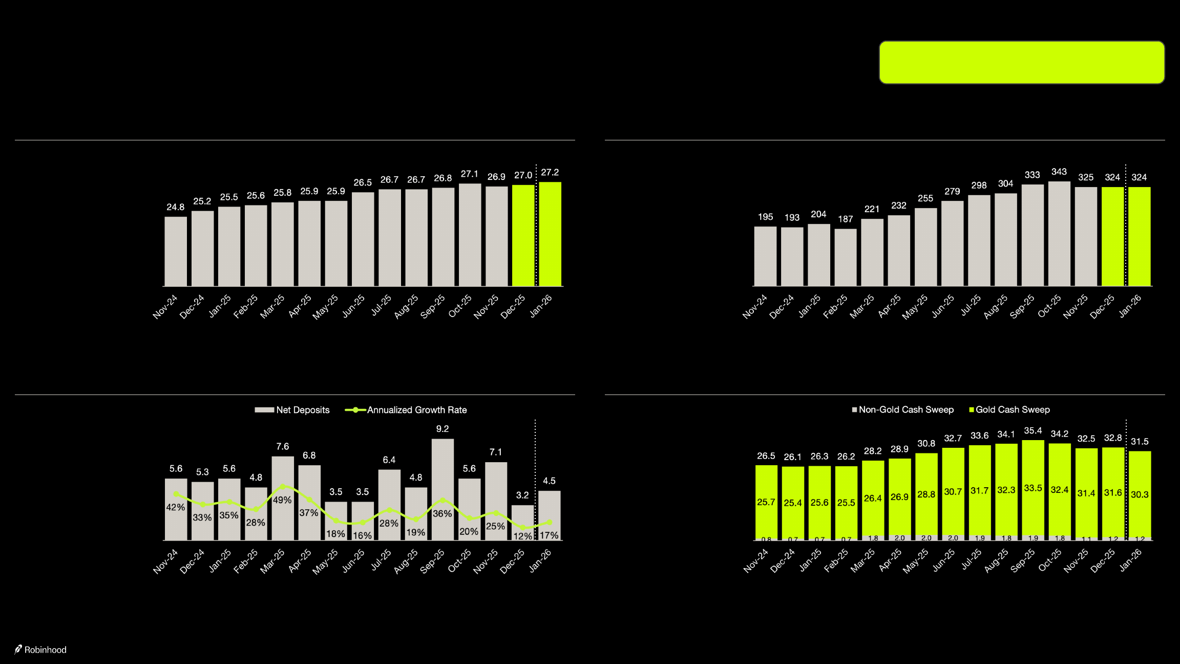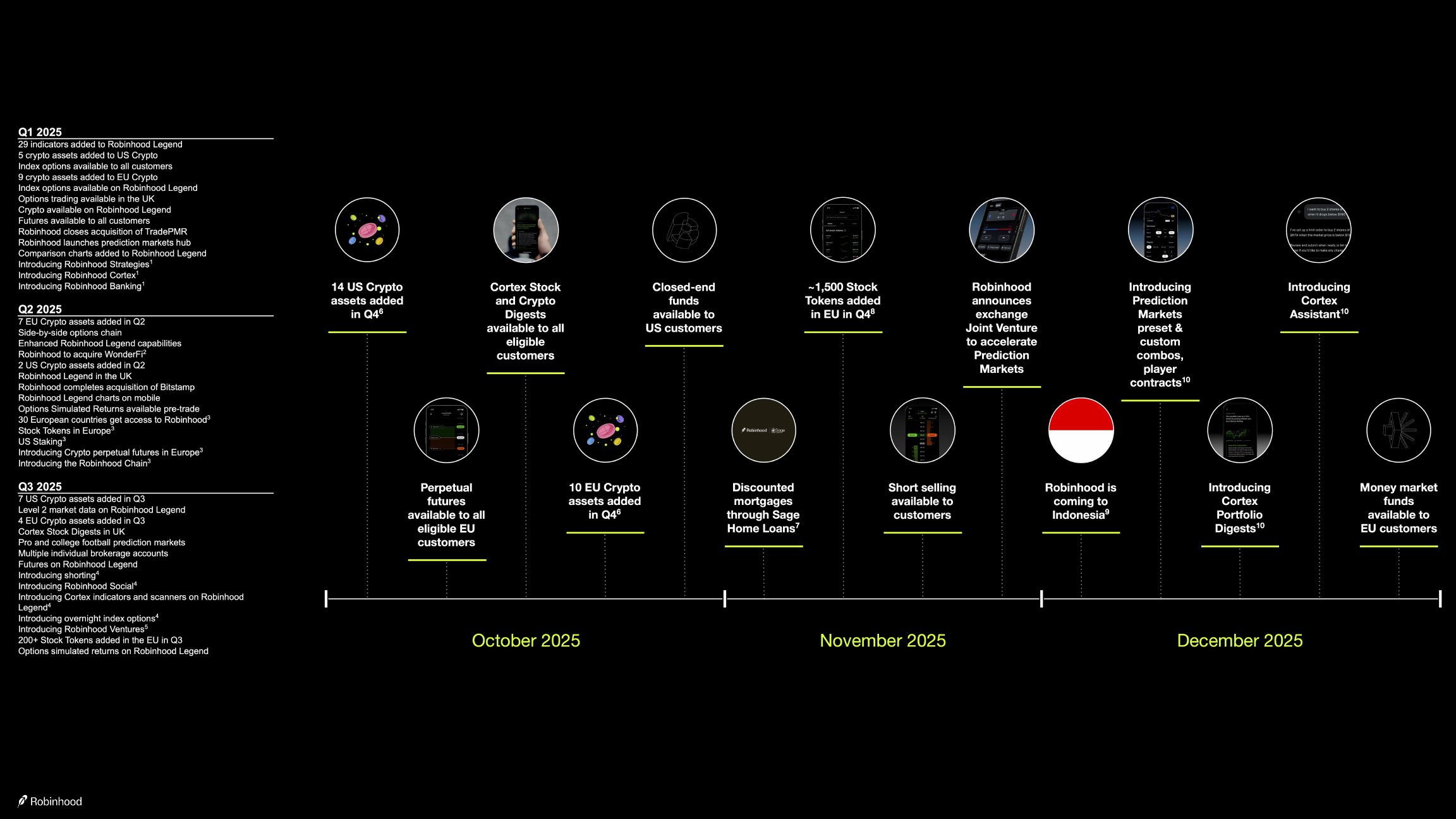 This presentation and the related webcast contain forward-looking statements regarding our expected financial performance and our strategic and operational plans, including (among others) statements regarding that Robinhood Social is rolling out early 2026, Robinhood Cortex indicators and scanners on Robinhood Legend are rolling out early 2026 to Gold Subscribers, overnight index options are rolling out early 2026, custom combos are rolling out early 2026, and Cortex Assistant is rolling out early 2026 to Gold Subscribers; that Robinhood Ventures is a broader initiative that Robinhood is planning to launch to give retail investors exposure to private companies; that Robinhood is coming to Indonesia; that our pending acquisitions of PT Buana Capital Sekuritas and PT Pedagang Aset Kripto are expected to close in the first half of 2026; our 10 Year Vision, including our plans to be #1 in Active Traders, #1 in Wallet Share for the Next Generation and #1 Global Financial Ecosystem and how we plan to do so; that Stock and Crypto Digests, Portfolio Digests, and Trade Builder are coming soon; that we anticipate diluted share count will be roughly flat in 2026; that with over $4B in corporate cash, investments, and stablecoin, we are well positioned to continue deploying capital; that we believe the strength of our balance sheet gives us the flexibility to run our business while investing for future growth; that we will continue to look to drive growth and shareholder value by allocating capital across organic growth, M&A, and shareholder returns; that we continue to repurchase shares in Q1, with flexibility to accelerate if market conditions warrant; that the majority of the remaining Gold deposit boosts earned by customers prior to the end of the program will be paid out over a period of 10 months; that we plan to more than double the amount of customers with Gold Cards this year to over one million by the end of the year; that, with respect to Global Financial Ecosystem, we're excited to watch these businesses scale as we launch in new jurisdictions and round out the product offerings and think in a few years we'll look back and have really underestimated how big our international offering can be; that we've got a lot of headroom here as our customers grow faster than the industry, and we continue to deliver new products and capabilities; that our business continues to diversify with several more making great progress toward achieving over $100 million in annualized revenue, including Robinhood Legend which is nearly there, the Gold Card which is on track for this year, and TradePMR, Futures, Index Options, and Robinhood Banking, which are all scaling; that in 2026 we plan to ramp up our product velocity even faster, while delivering another year of profitable growth; that there is a massive opportunity in front of us, and we see the path to compound shareholder value for years to come; that we're going to keep adding to Robinhood Gold's value proposition; that we believe shipping even more products and value to customers can deliver outsized growth for years to come; that we aim to deliver another year of 20% plus Net Deposit growth; that we're well on our way to exceed $1 trillion in assets in the coming years; that we feel confident that we can generate strong returns on our investments; that we'll continue to be lean and disciplined in the way we allocate capital and operate; that we believe that as we continue to execute, Robinhood will become increasingly synonymous with the financial services category as the finance SuperApp; that we're just at the beginning of a Prediction Markets supercycle that could drive trillions in annual volume over time; that we're going to continue to invest in Prediction Markets in 2026; that we're adding new products, account types, and capabilities, that this year you should see acceleration in app design and personalization; that Cortex Assistant and Cortex for Legend are rolling out in the coming months and scaling throughout the year; that we intend to be at the forefront of AI in trading; our expectations regarding Family Investing and private markets, which are two big strategic moves that we're making this year; that in 2026, we'll be launching our referral program for TradePMR advisors; that we believe we can be the major beneficiary of the ongoing $100 trillion-plus wealth transfer; that we've got some exciting things coming on the Family Investing front at our event in NYC; that we think private markets could become even bigger than prediction markets; that a big part of 2026 will be seizing the tokenization opportunity, which we think dovetails nicely with our DeFi work which is accelerating; that tokenization and continued expansion into new geographies with several new international markets coming later this year; that Robinhood is well positioned to lead in AI and crypto; that a lot more is coming this year for AI and we'll continue using AI and that this year, we're continuing to automate and optimize the entire engineering pipeline, from writing code, to code review, deployment, and testing; that we're making rapid progress in software engineering with respect to AI and we'll continue to saturate usage of new and improving tools, as well as continue pushing to optimize and automate the entire engineering pipeline, including coding and code review; that we're going deeper into DeFi, making improvements to Robinhood Wallet, and working hard to launch the Robinhood Chain; that you'll see us continue to push new geographies with several new international markets coming later this year and that we plan to keep making progress both in regions we've already announced and some new ones that are underway; and that we think there is an opportunity to tokenize a significant portion of what we offer our customers on the platform today; as well as all statements about our FY 2026 financial outlook. Forward-looking statements generally relate to future eve